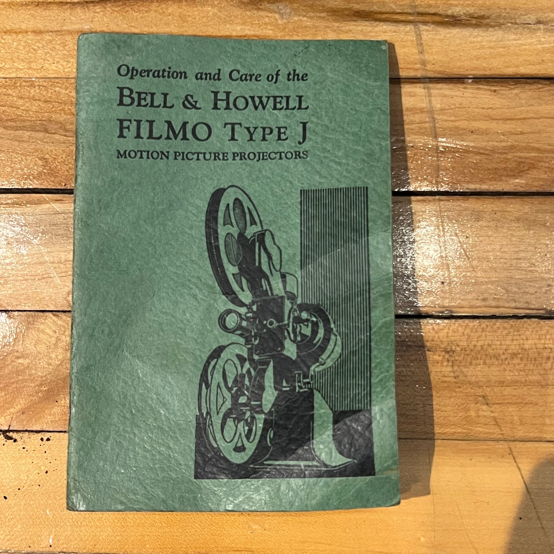 1930s-era Bell & Howell Filmo Type J (model 57) 16mm projector in working order. Forward and reverse work, bulb works, voltage meter works. Have run film through it however. Case is in good shape but missing one metal glide on the bottom, which has been replaced with a brown felt furniture glide. The black foam pad on the bottom of the projector deteriorated and got sticky, so it has been covered over with black gaffer tape. Comes with small take up reel, extra projector bulb, color lens and manual. Case does smell a bit musty inside.