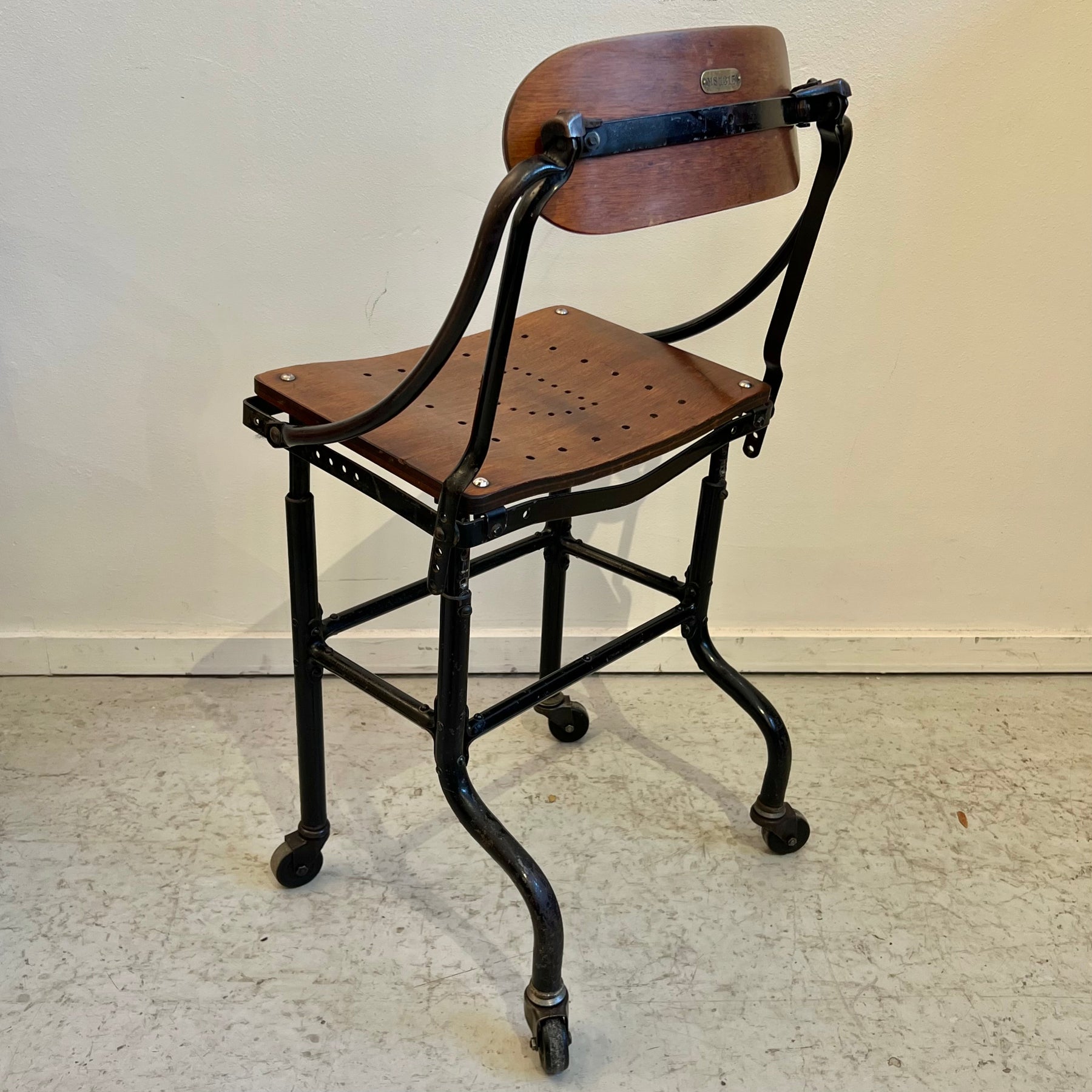 Very excited about this rare early DoMore industrial work chair circa early 1920s. It features a steel frame in its original black paint and a plywood seat and back. Despite having a nice patina associated with its age and use, it is in exceptional condition for being over a century old. Rarer still is the pattern of holes drilled into the seat forming a square with the letter D (for DoMore) within. The original paper tag is still affixed to the bottom and mostly intact. There is a small brass inventory tag affixed to the back of the backrest. The chair is also adjustable. The backrest can be lowered and set back by positioning the bolts along the side of the seat that hold the back supports, and the height of the seat can be adjusted every inch by resetting the bolts in the four posts under the chair that connect to the legs.