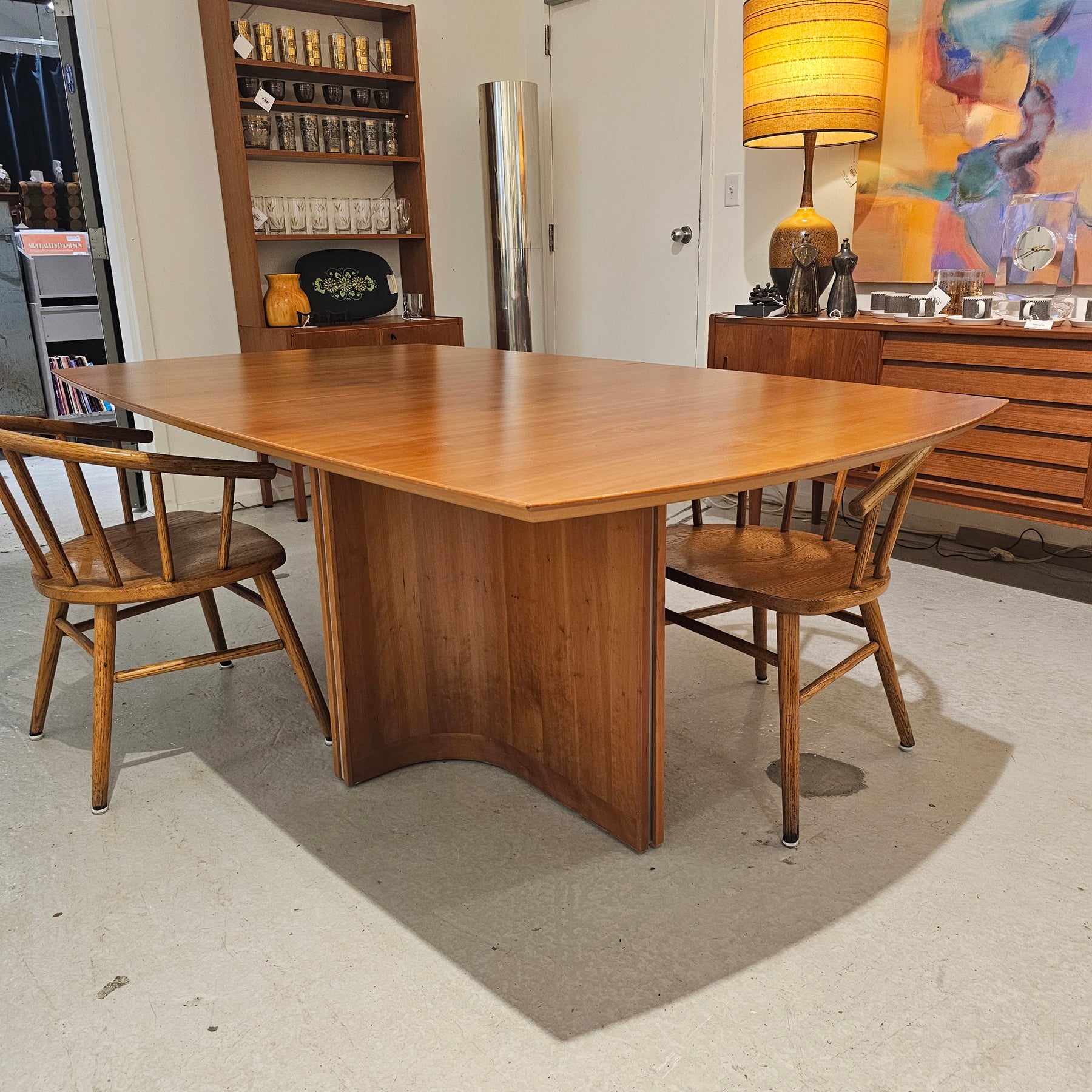Stunning, large contemporary cherry dining table. Tone matches well with most teak pieces. This table expands to allow for internal storage of two additional leaves.