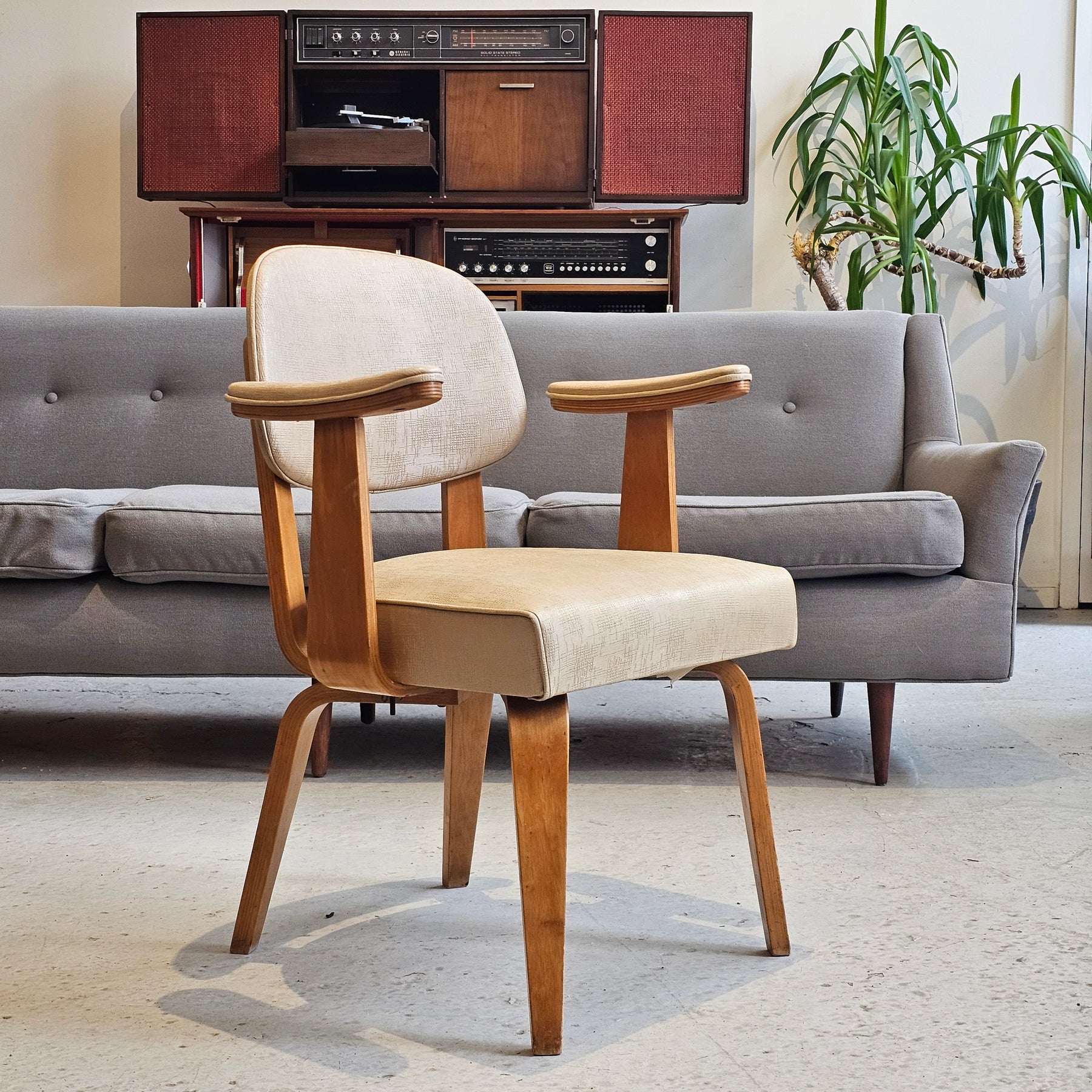 Rare, Thonet, bentwood armchair. Original vinyl in overall good condition, frame is sturdy. Some visible repairs to underside of armrests present. Original Thonet tag still intact.
