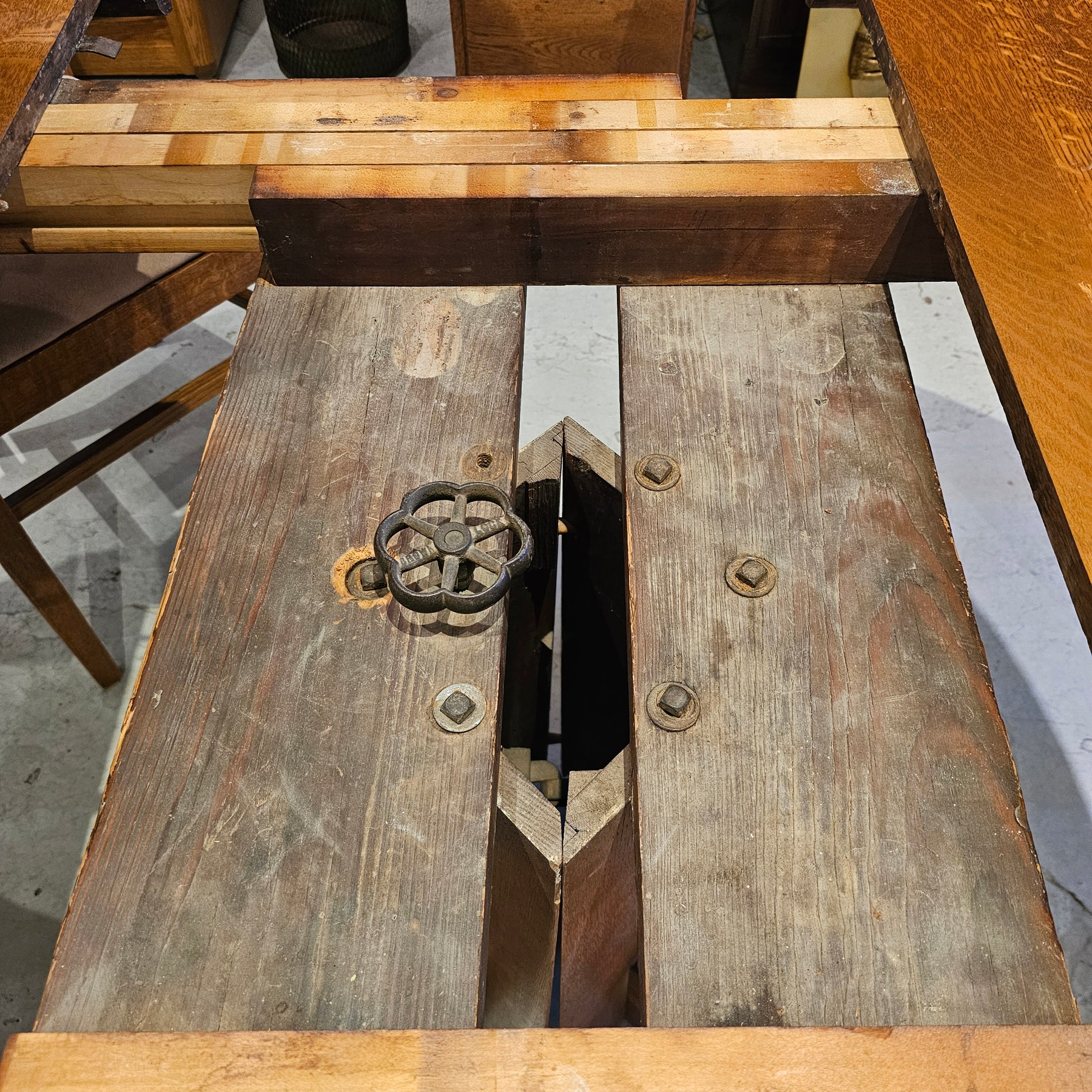Antique Oak Dining Table. Includes five individual leaves, allowing table to go from a circular 48" diameter to 93" long. Chairs sold separately.