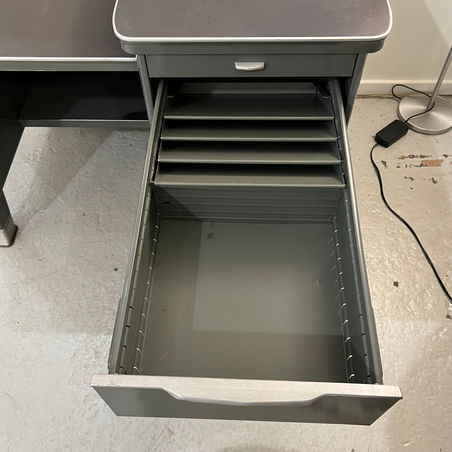 1960s-era General Fireproofing “Generalaire” series single-pedestal metal desk, with a bi-level design used for adding machines. Extremely sturdy and in excellent condition aside from some scratches and wear common to age and use. Freshly cleaned inside and out. Drawers have many different storage configurations, and there is a 12” deep shelf below.