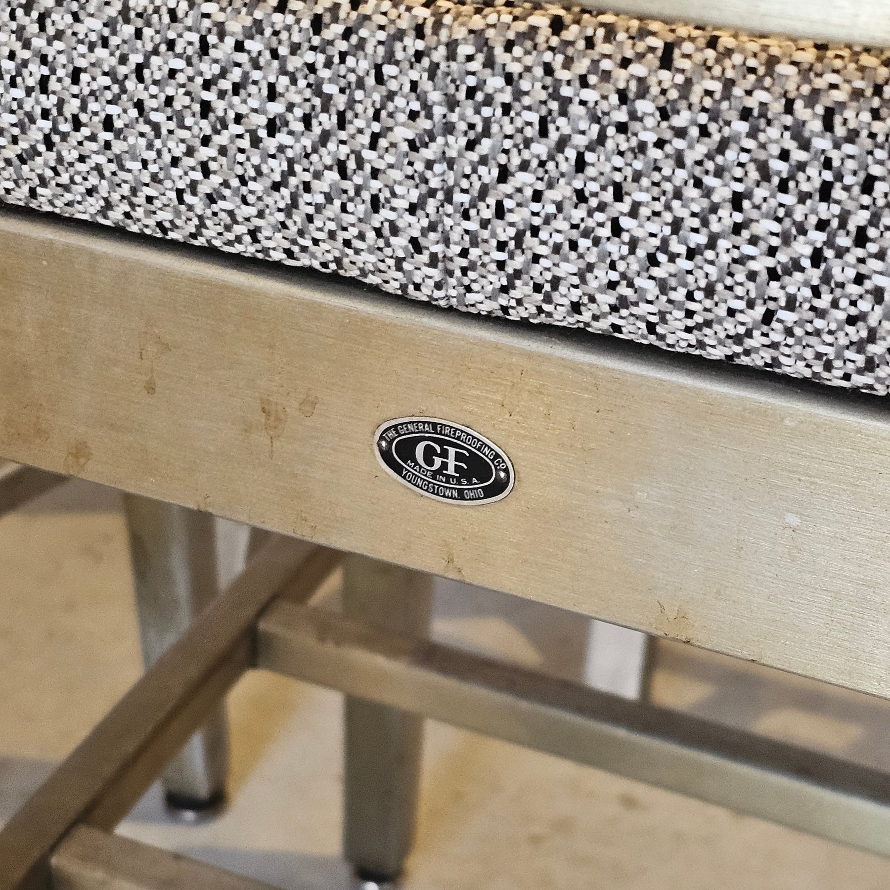 Set of Six Goodform Aluminum Navy Dining Chair. Aged patina present with updated upholstery.