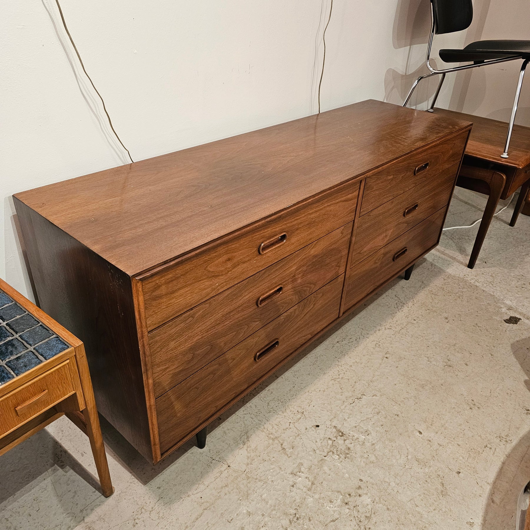 Jack Cartwright Lowboy Dresser.   Signs of wear, including light scratches, as well as a veneer chip to back corner on one side.