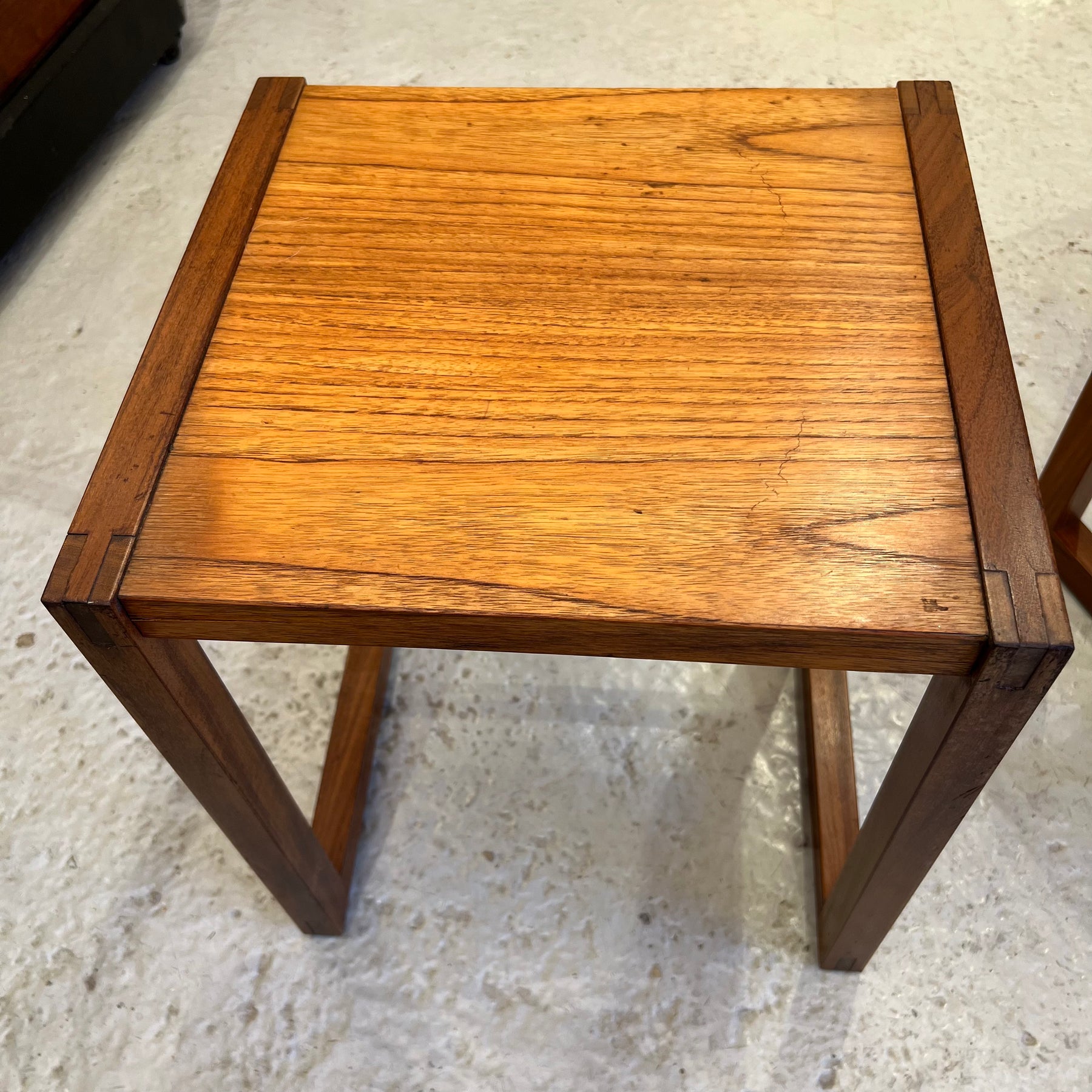Pair of 1980s-era sleek petite end tables/nightstands by Moebles Les R.S. of Montreal. Solid, stylish and clean, though finish has signs of age and use, more so on one than the other.